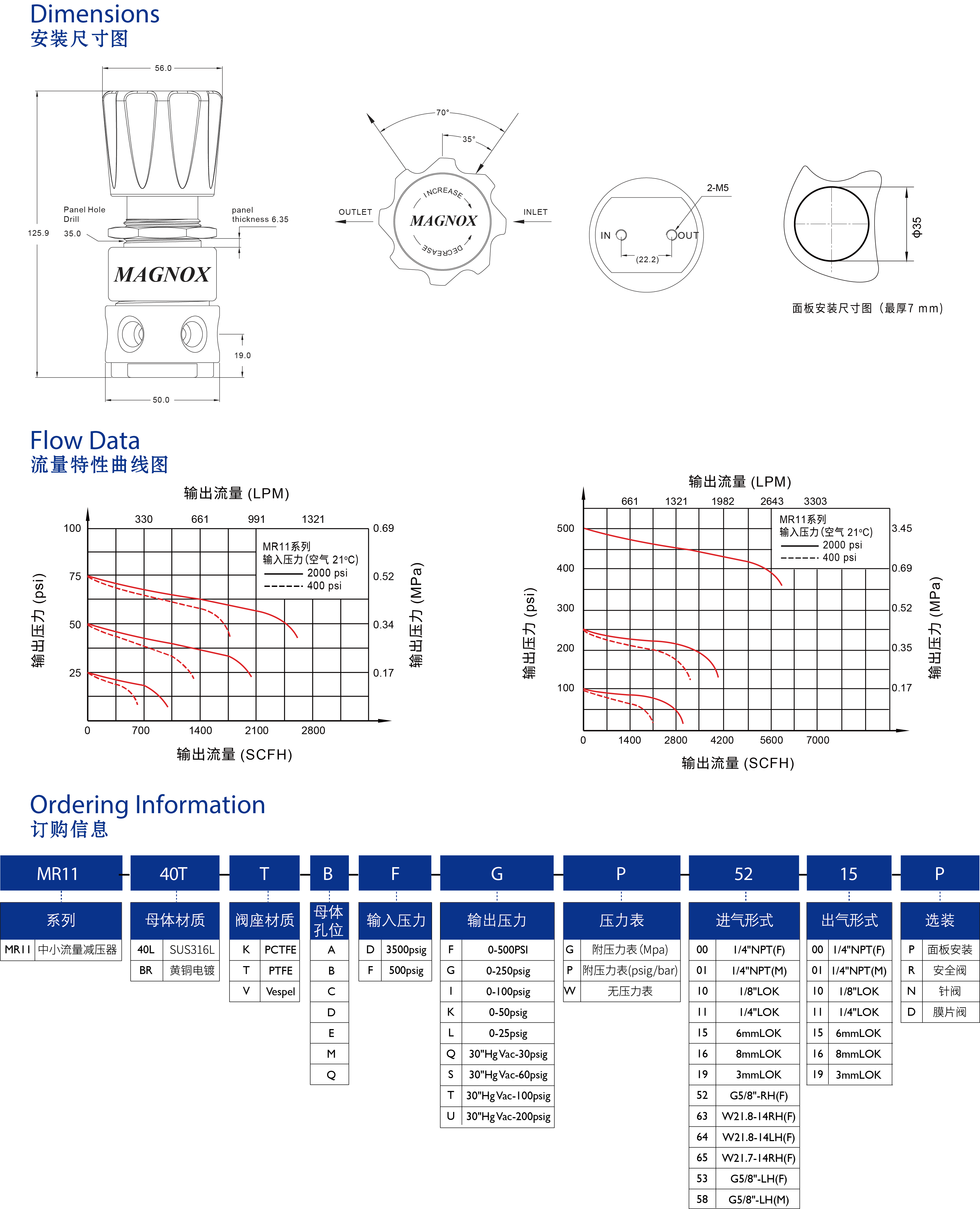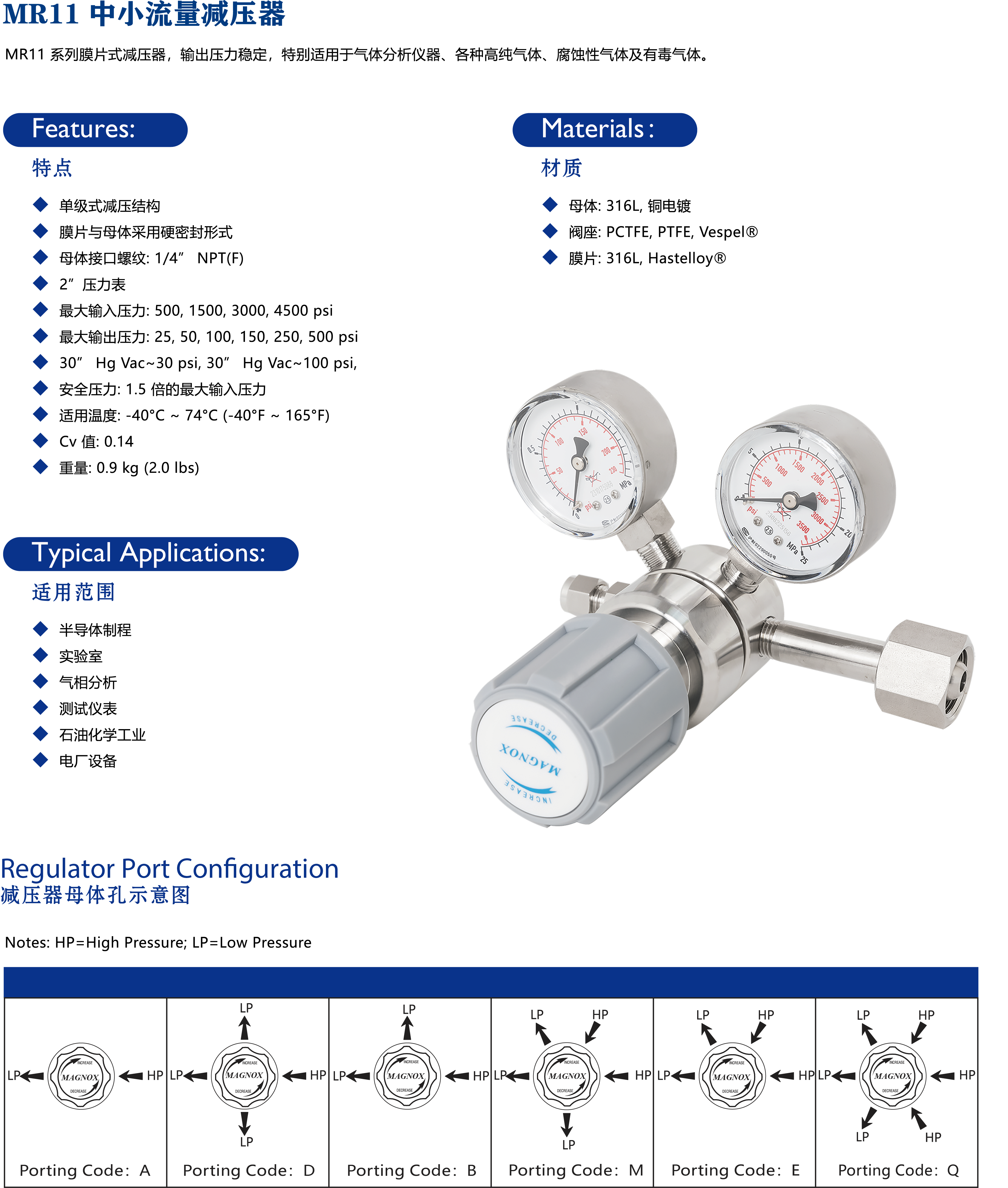 MR11 系列膜片式减压器,输出压力稳定,特别适用于气体分析仪器、各种高纯气体、腐蚀性气体及有毒气体。