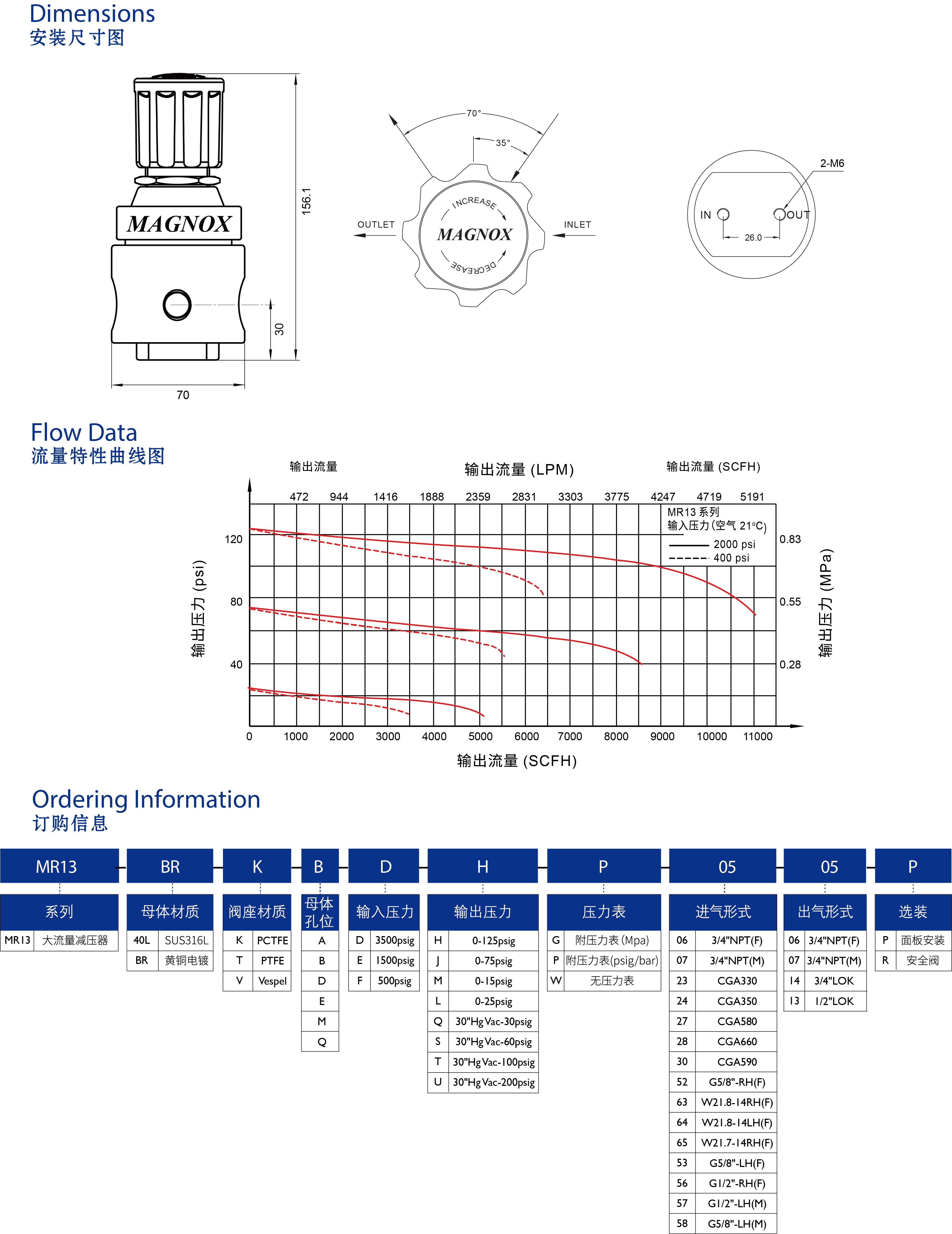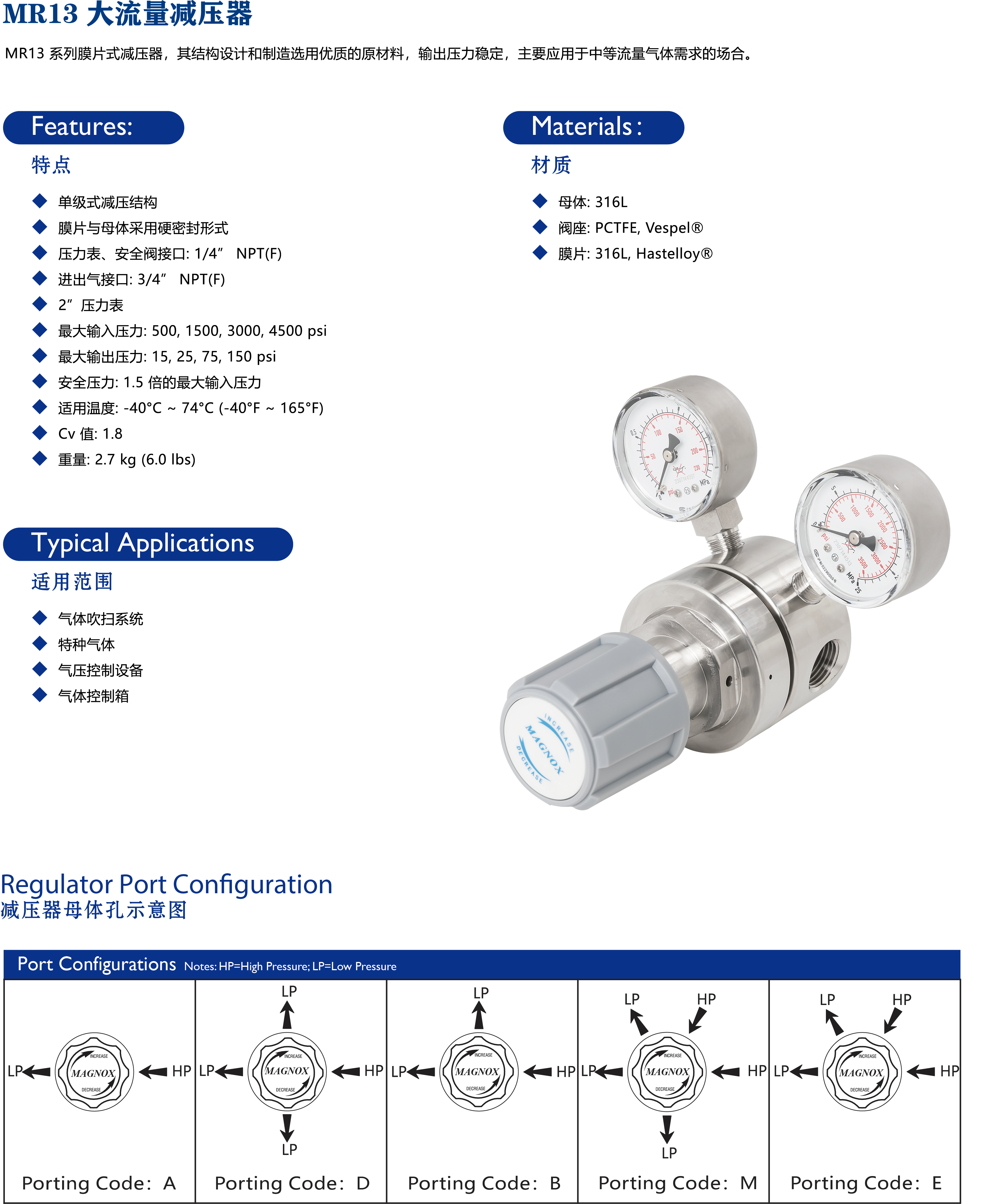 MR13 系列膜片式减压器,其结构设计和制造选用优质的原材料,输出压力稳定,主要应用于中等流量气体需求的场合。