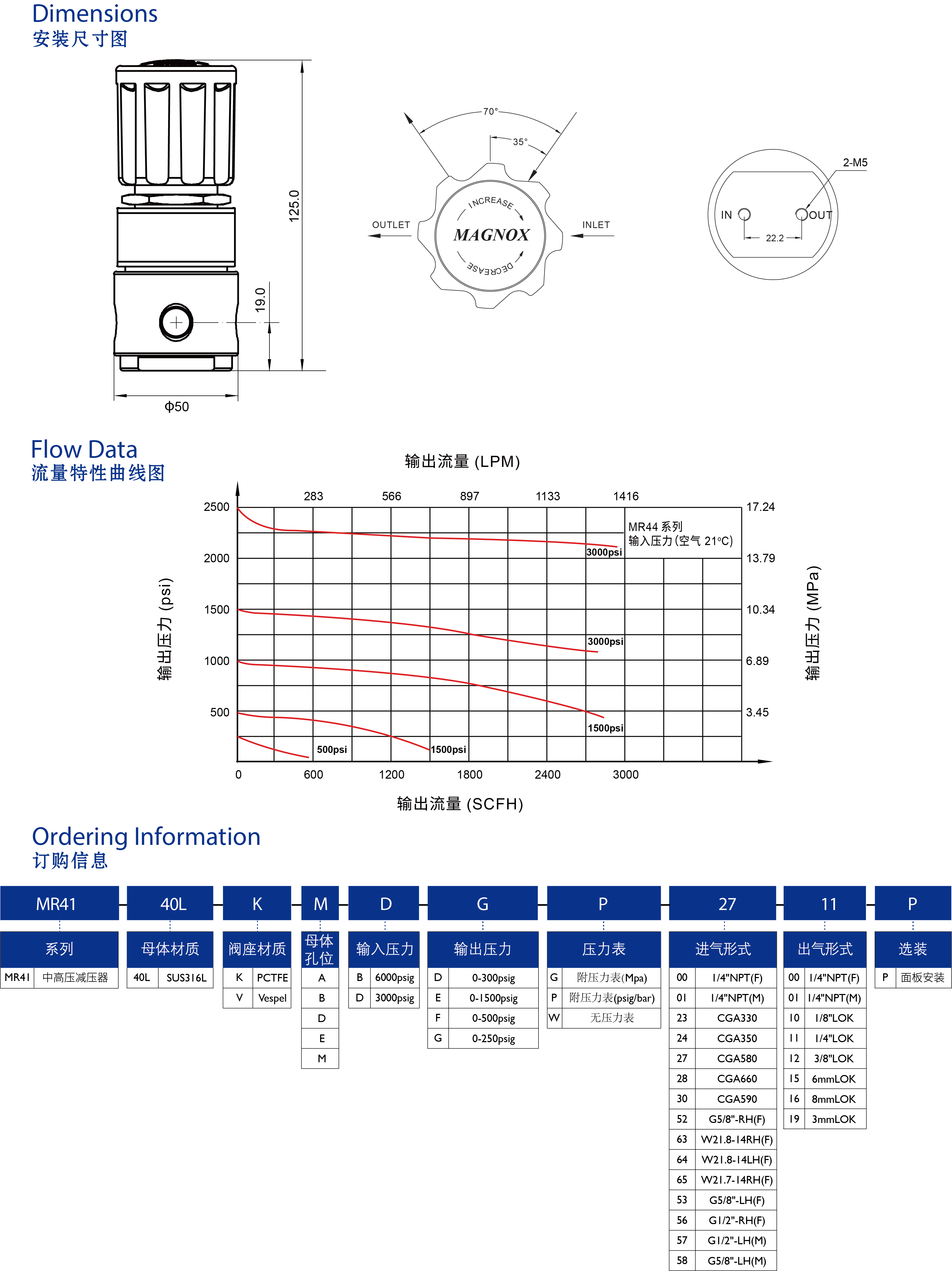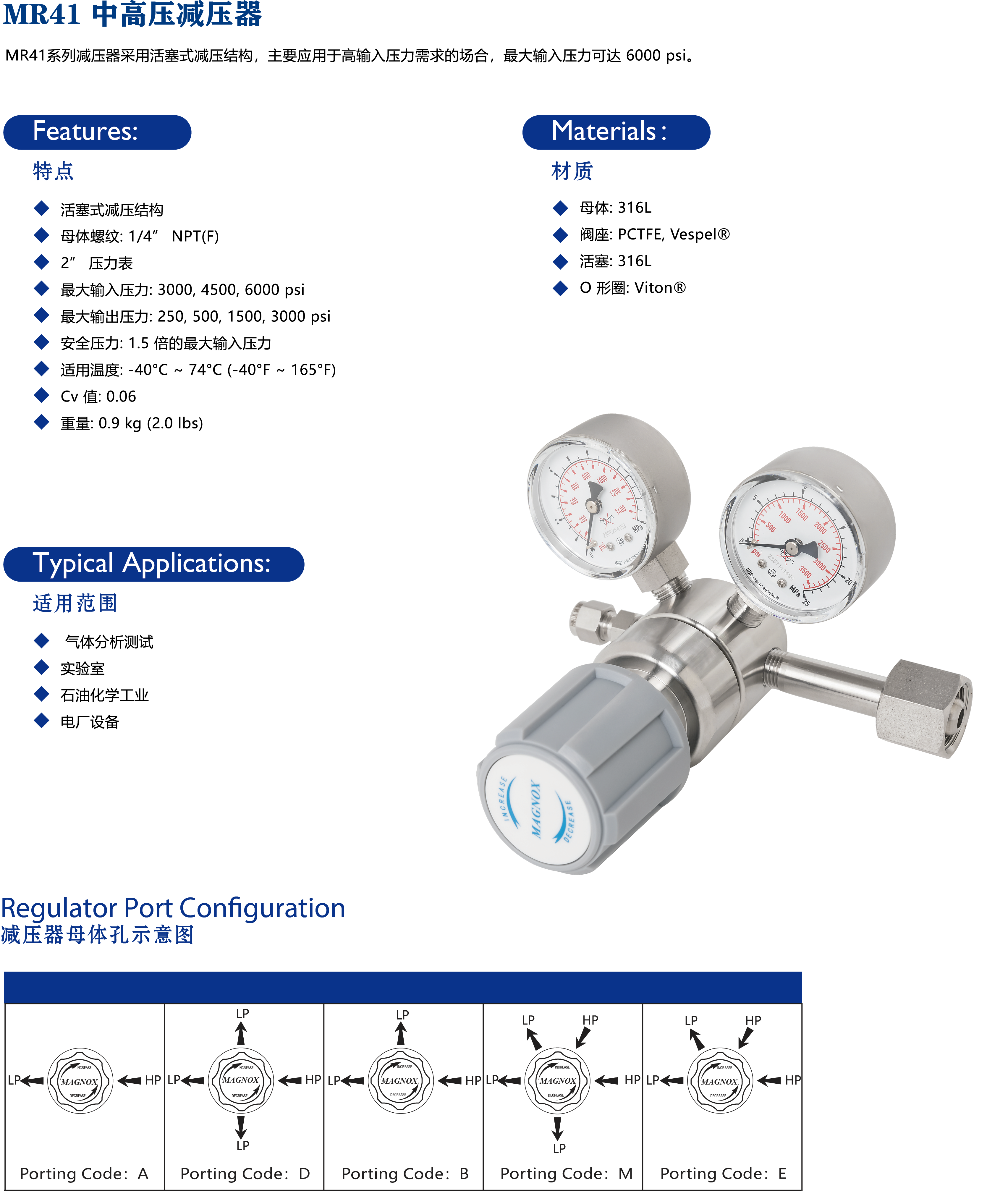 MR41系列减压器采用活塞式减压结构,主要应用于高输入压力需求的场合,最大输入压力可达 6000 psi