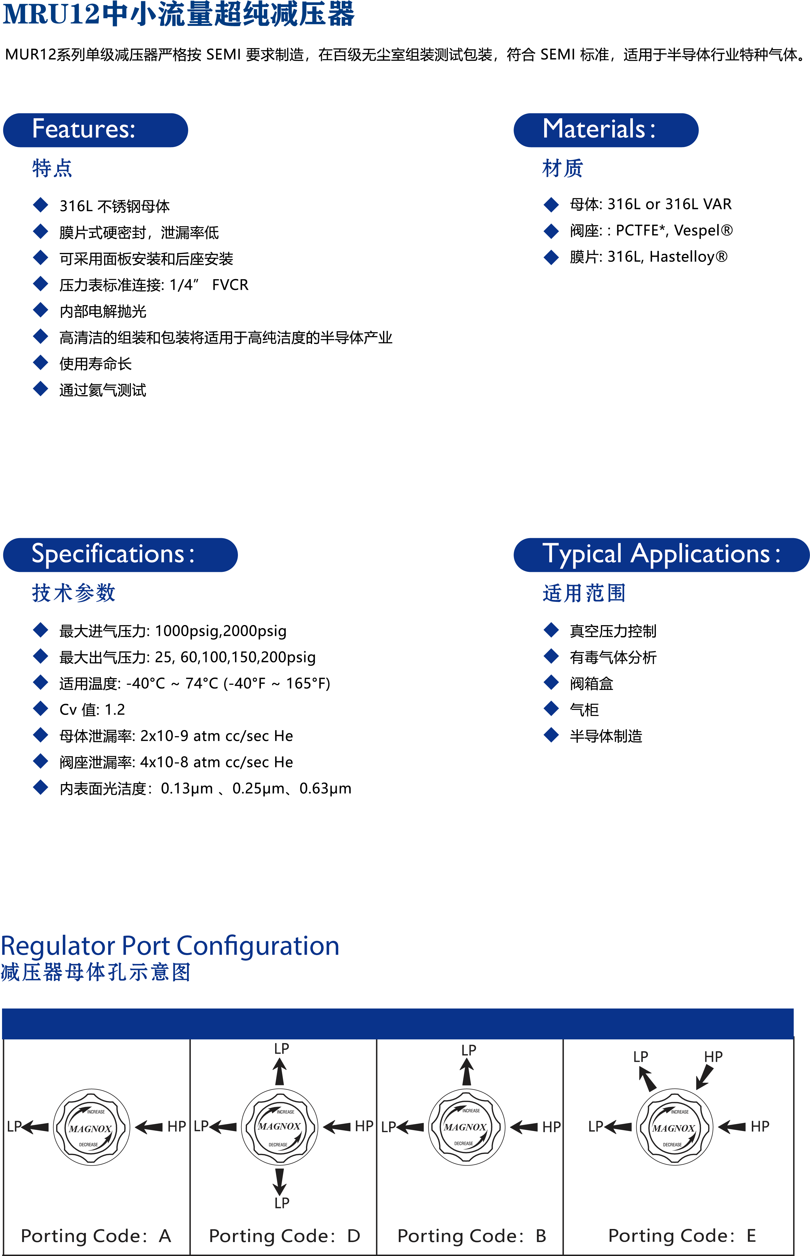 MUR12系列单级减压器严格按 SEMI要求制造,在百级无尘室组装测试包装,符合 SEM 标准,适用于半导体行业特种气体。