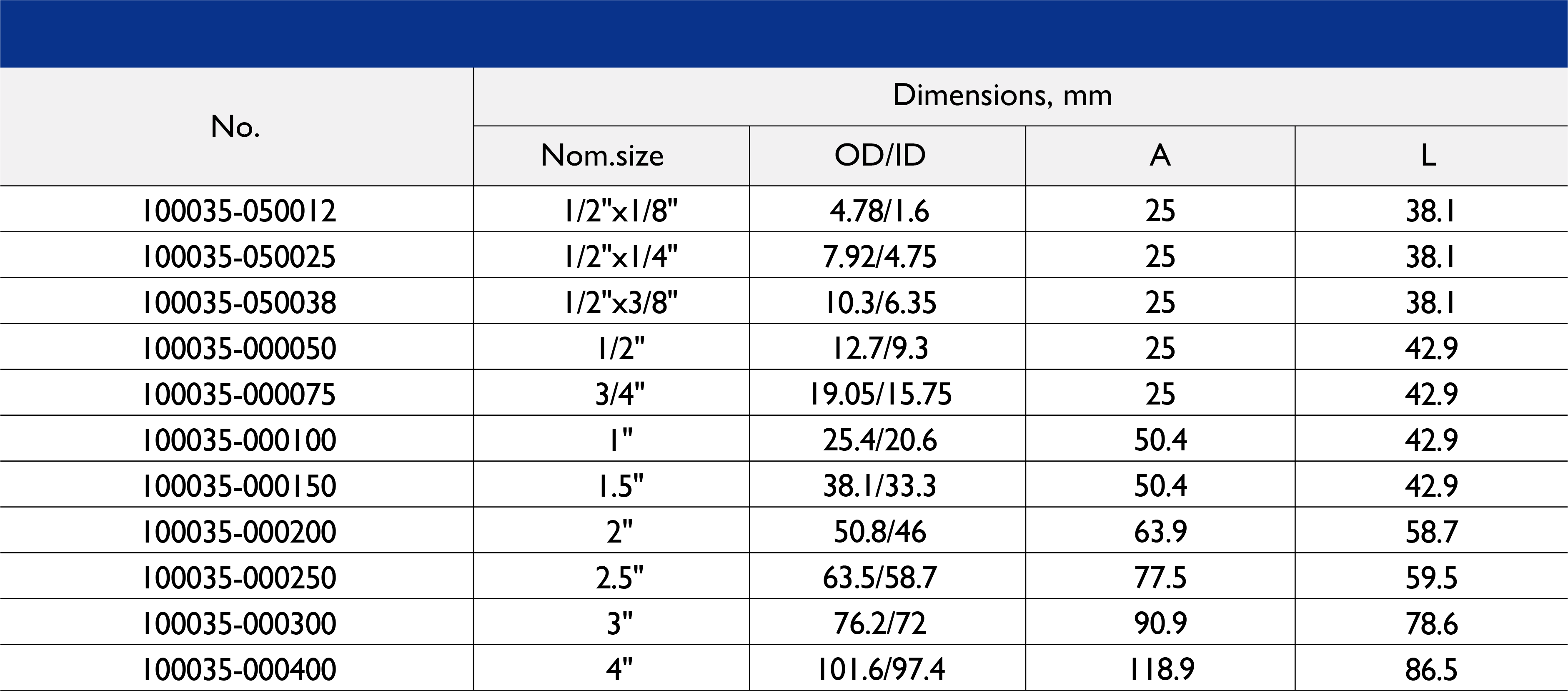 尺寸范围:1/2 英寸至 10 英寸